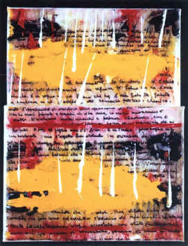 Sono immagini che ti catturano e che esaltano le caratteristiche del mondo infantile e della prima adolescenza: la .purezza, la fiducia e la spontaneità. La particolare tecnica pittorica usata, olio diluito su tela di garza, dà una dimensione tutta particolare a queste immagini rendendole suggestive, ma rarefatte ed impalpabili. Tania Pistone ci presenta invece tematiche più aggressive. Un lavoro sull’archetipo della scrittura visto come elemento- traccia dell’esistenza dell’uomo. gie di testi, da semplici annotazioni a pagine intensamente scritte alla base delle suo opere.