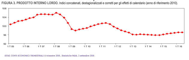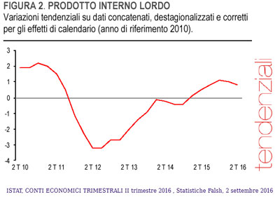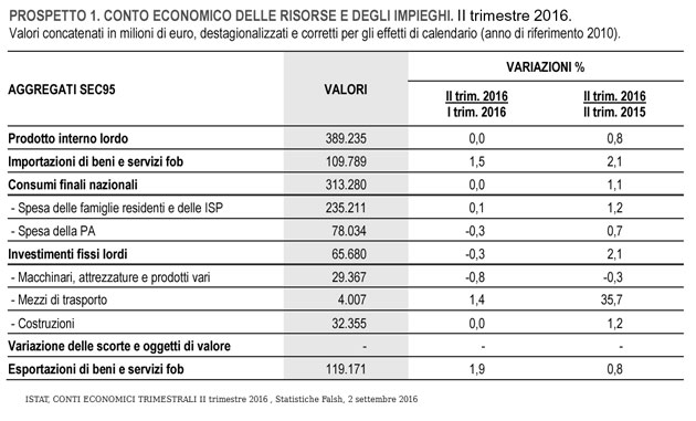 Nel secondo trimestre del 2016 il prodotto interno lordo (PIL), espresso in valori concatenati con anno di riferimento 2010, corretto per gli effetti di calendario e destagionalizzato, è rimasto invariato rispetto al trimestre precedente ed è aumentato dello 0,8% nei confronti del secondo trimestre del 2015.